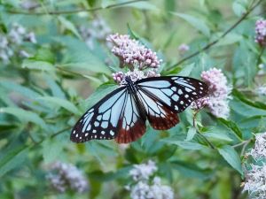 浅葱色(あさぎいろ)の美しい模様をもつ翅を広げ、年間で1,000km以上もの長距離を移動する大型の蝶です。アサギマダラは「フジバカマ」や「ヒヨドリバナ」の蜜を好み、それらの群生地を求めて飛来します。